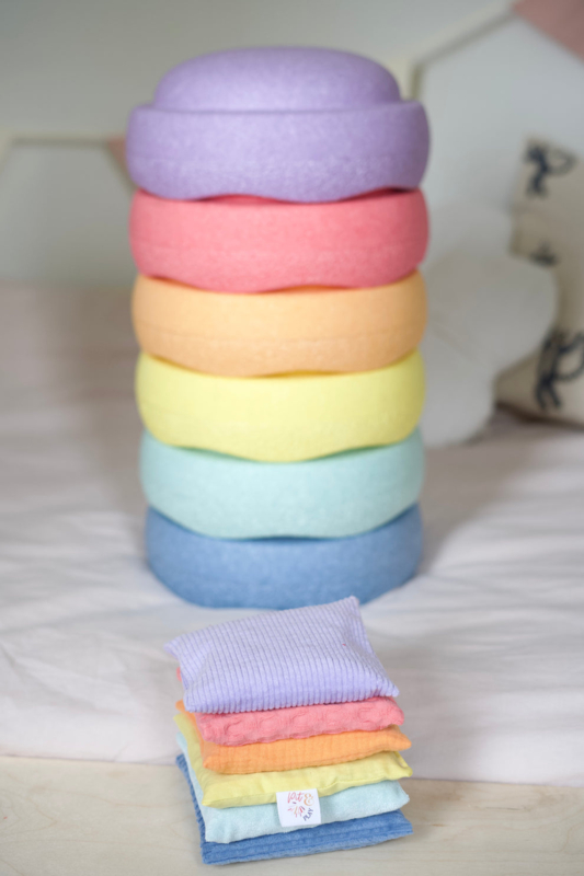 Onze Regenboog Pittenzakjes pastel zijn een van de meest geliefde aanvullingen op open einde speelgoed zoals Stapelstein, Grapat, Grimm’s, magnetische tegels én onze eigen katoenen speeldoeken en dobbelstenen. De zakjes sluiten perfect aan bij de Stapelstein regenboogkleuren en zijn gemaakt om zintuigen, motoriek en fantasierijk spel te stimuleren.
